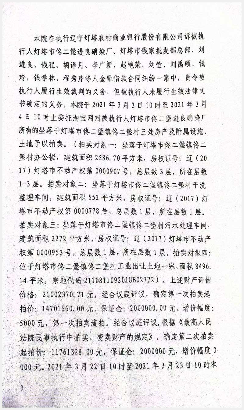 名稱:燈塔市佟二堡鎮(zhèn)佟二堡村房產(chǎn)及土地使用權(quán) 面積:房產(chǎn):5,410.7㎡;土地:8,496.14㎡ 瀏覽次數(shù):421