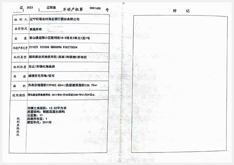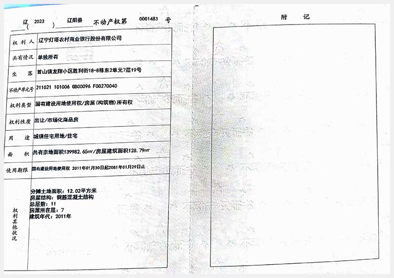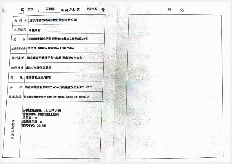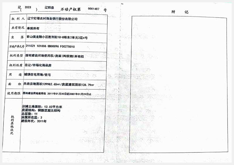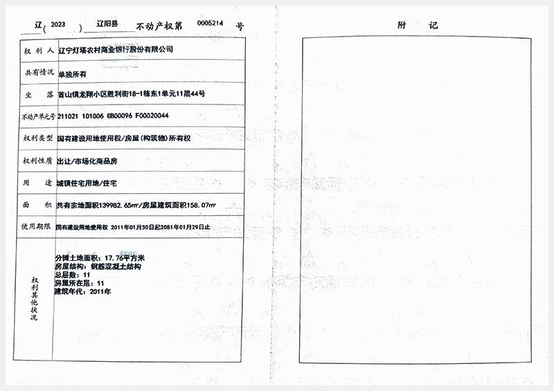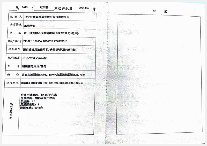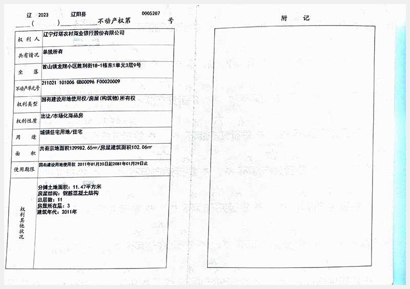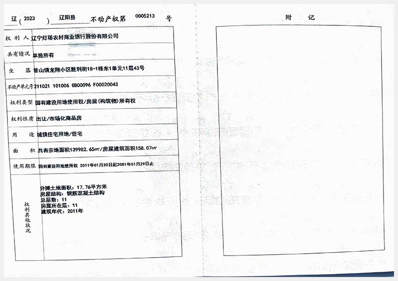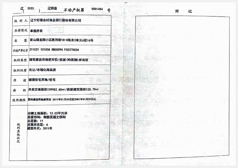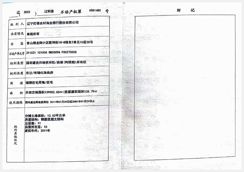 名稱:遼陽(yáng)市首山鎮(zhèn)龍翔小區(qū)勝利街18棟房產(chǎn) 面積:102.06㎡—162.71㎡ 瀏覽次數(shù):395