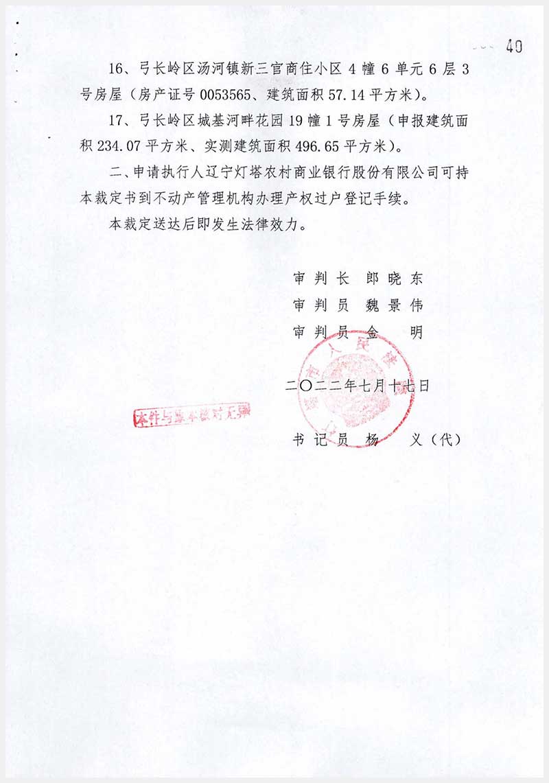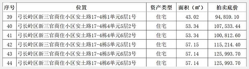 名稱:遼陽(yáng)市弓長(zhǎng)嶺區(qū)湯河鎮(zhèn)新三官商住小區(qū)房產(chǎn)6處 面積:1單元6層1號(hào):43.02㎡;4單元5層2號(hào)、4單元6層2號(hào):53.34㎡;5單元5層1號(hào):57.15㎡;5單元6層3號(hào)、6單元6層3號(hào):57.14㎡ 瀏覽次數(shù):279